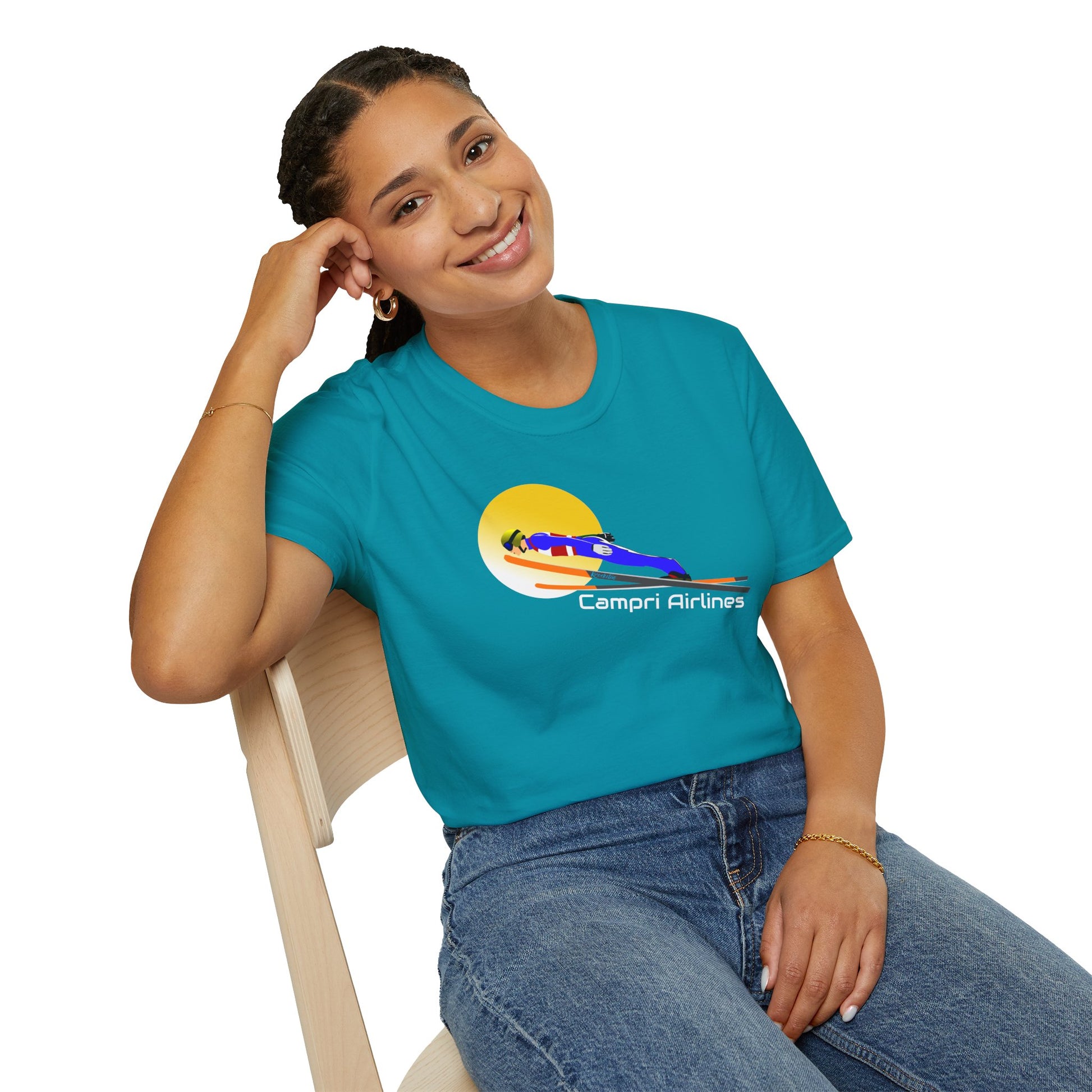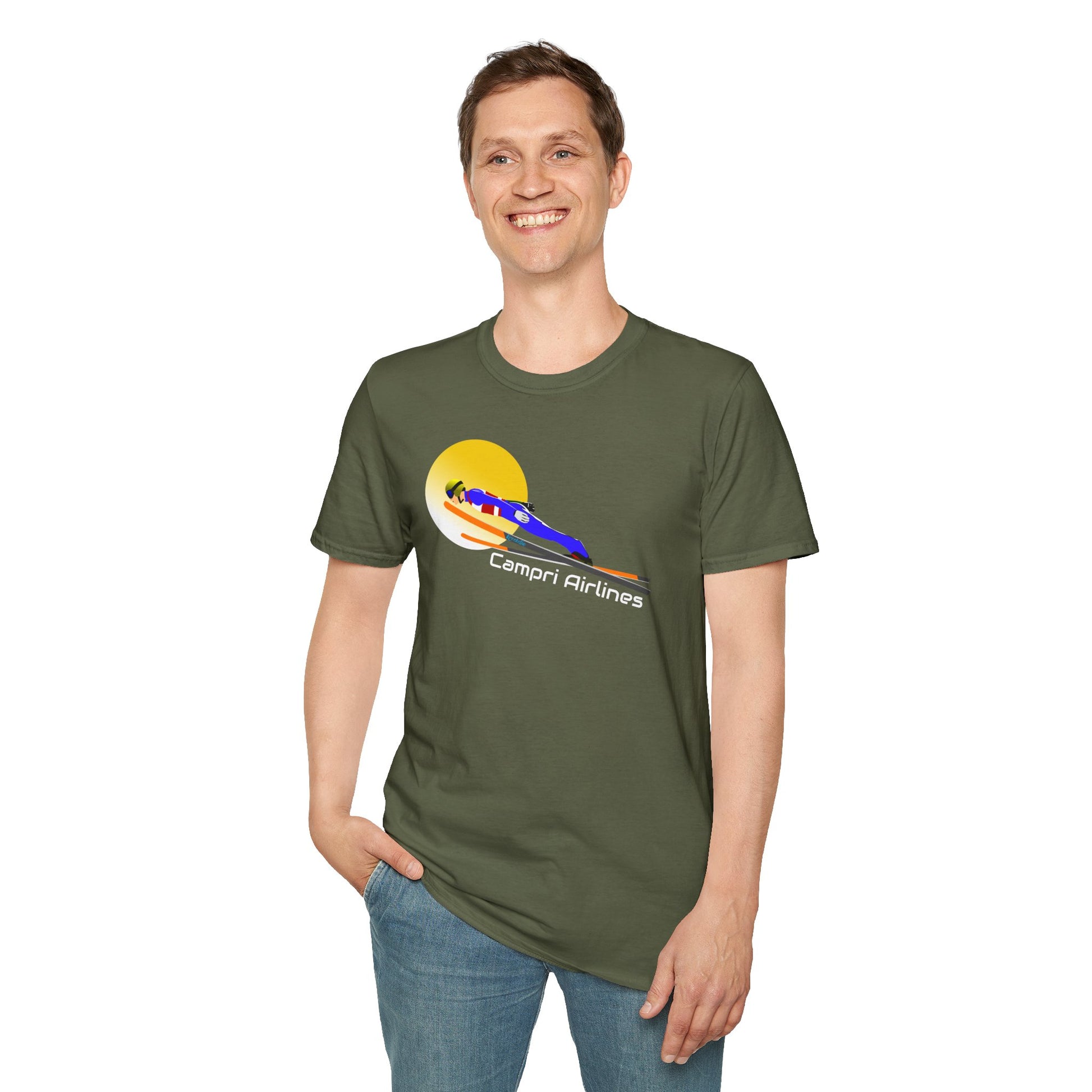 CAMPRI AIRLINES Unisex T-shirt tribute to the ski jumper Andrea Campregher . Perfect for winter sports lovers. The lightweight fabric and classic fit offer comfort and style for all occasions. Ideal for ski jumping lovers, ski lovers. winter sports enthusiasts and those who love a casual yet versatile look.