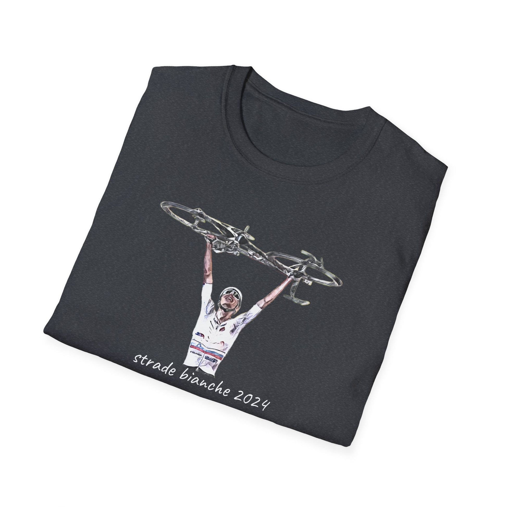 Celebrate the spirit of cycling with our exclusive unisex Tadej Pogačar Strade Bianche 2024 T-Shirt, featuring an eye-catching design by an Italian artist.